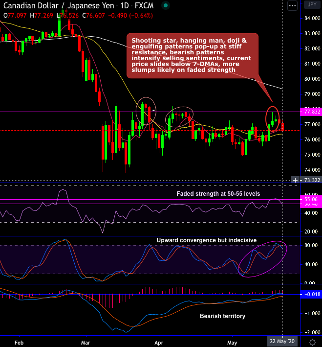 CADJPY resumes bearish swings on failure swings at the stiff resistance zone of 77.832 levels.