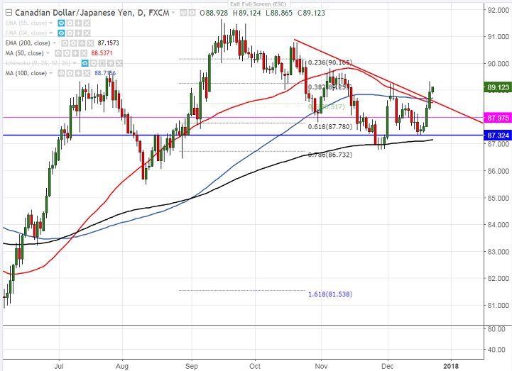 - CAD/JPY has broken trend line resistance at 88.67 and jumped till 89.33. The main reason for jump in Canadian dollar against all majors was due to better than expected economic data. The pair jumped 200 pips from the low of 87.32 on Dec 18th 2017. It hits high of 89.33 and is currently trading around 89.13.
