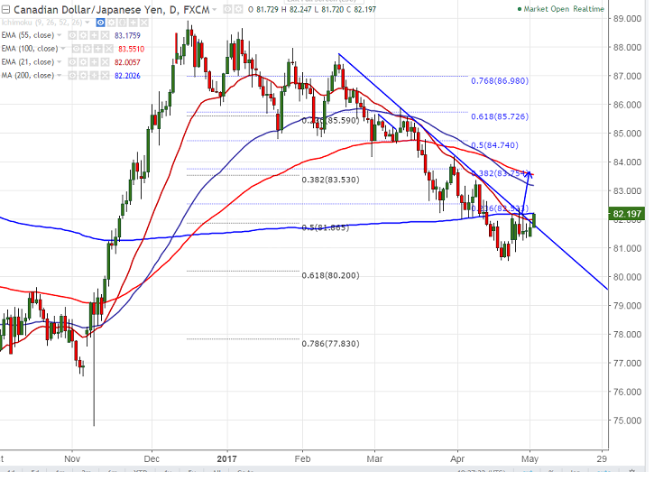 - CAD/JPY has shown a minor decline till 81.27 after hitting high of 82.39 on Apr 26th 2017 on account of weak crude oil price. The pair jumped and broken 200- day MA (82.19) at the time of writing. It is currently trading around 82.23.