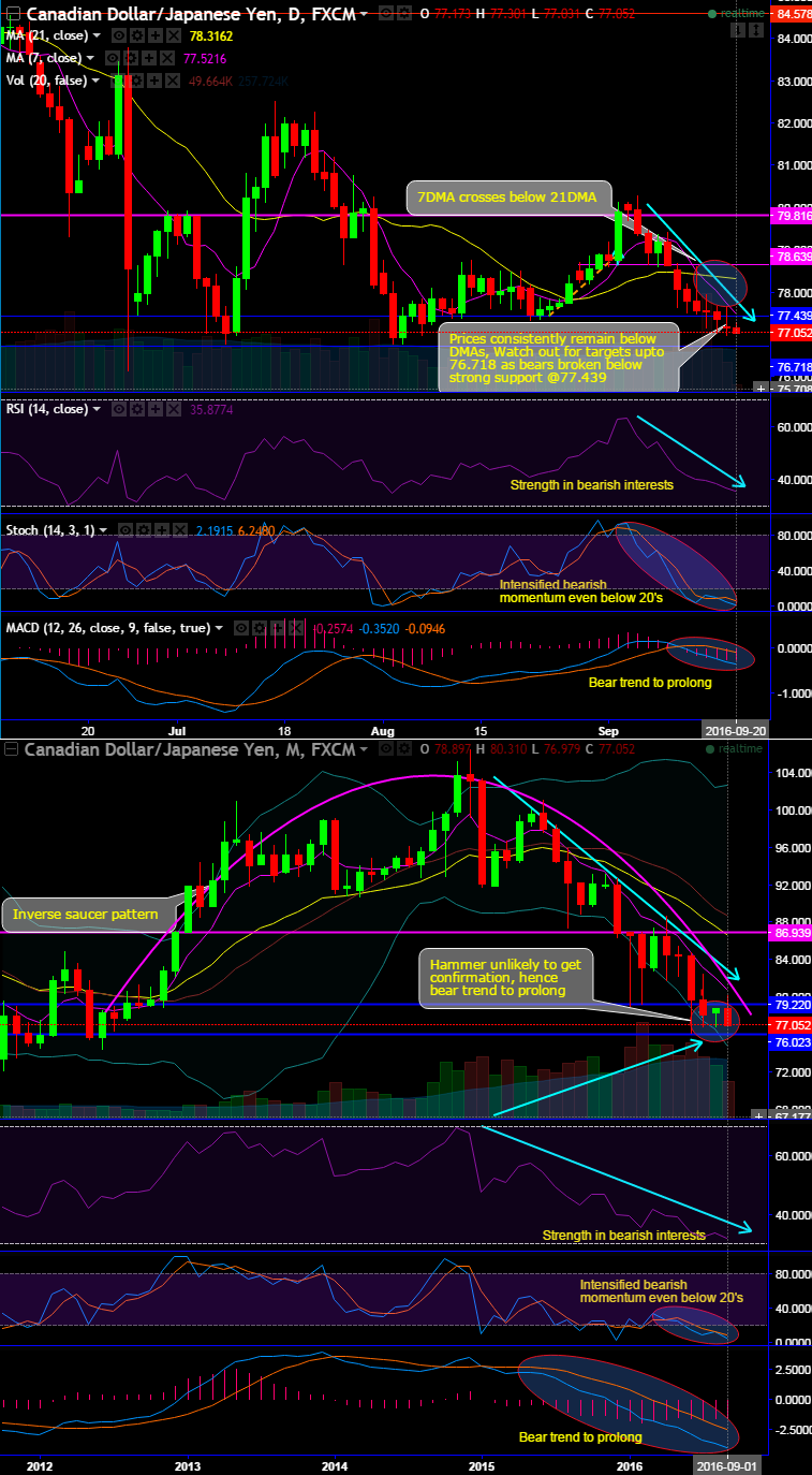 Prices consistently remain below DMAs, watch out for targets up to 76.718 as bears broken below strong support at 77.439 levels.