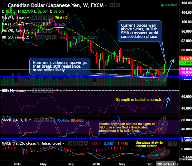 On weekly terms, this pair forms hammer pattern candle at 78.718 level which is bullish in nature, you could see that this hammer pattern now evidences upswings that break the stiff resistance of 78.639 and 79.816 levels, more rallies likely to head towards next strong resistances of 84.578 levels.