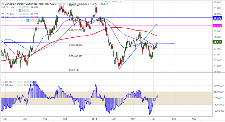 - CAD/JPY was trading higher continuously for past 11 trading days. The pair jumped nearly 300 pips from the low of 82.21.Bank of Canada (BOC) hiked rates higher by 25bpbs for fourth time since last summer amid trade tensions.The central bank has raised growth outlook for 2019 and 2020. But cautioned that more trade protectionism is the most important threat to global prospects. BOC confirmed that further rate hike will be data dependent and it will be in gradual pace. The pair has shown a minor decline after hitting high of 85.17. Loonie has declined sharply and hits low of 1.30650. But heavy dip in crude oil prices has made USD/CAD to recovery more than 140 pips till 1.32184.