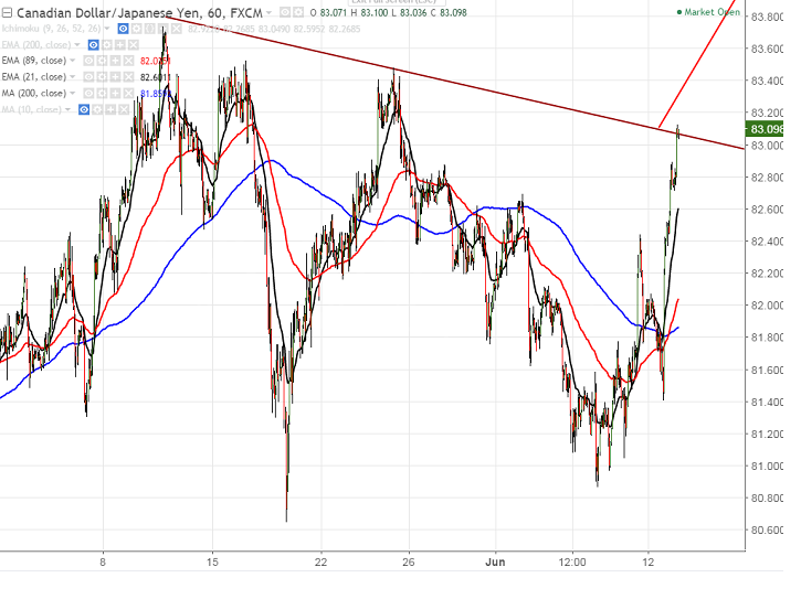 - CAD/JPY formed a temporary bottom at 80.88 and shown a continuous jump from that level. The pair broken major trend line resistance around at 83.05 (trend line joining 83.74 and 83.48) and jumped till 83.12. It is currently trading around 83.08.