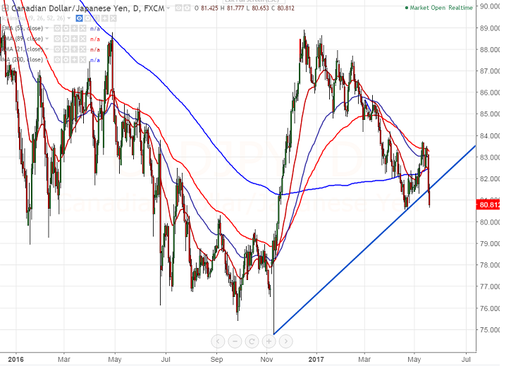 - CAD/JPY formed minor top at 83.75 after making a low of 80.57 on Apr 21st 2017 low. The pair is showing a decline for two consecutive days and also broken major trend line support at 81.45. It is currently trading around 80.89.