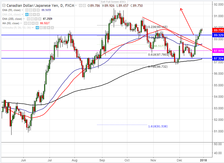 - CAD/JPY has broken major resistance 89.80 high made on Nov 6th 2017 yesterday and jumped till 89.92.The main reason for jump in Canadian dollar against all majors was due to strong crude oil price. The pair jumped almost 325 pips from the low of 86.75 on Nov 28th 2017. It is currently trading around 89.75.