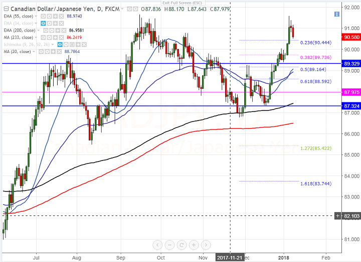 - CAD/JPY declined sharply after hitting a high of 91.58.The main reason for slight dip in Canadian dollar/JPY was mainly due to slight bullishness in Japanese yen against all majors. The pair declined almost 100 pips from the high of 91.58. It is currently trading around 90.55.
