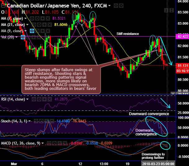 Recently, the shooting star and bearish engulfing patterns have occurred at 82.185 and 81.732 levels respectively. These bearish patterns are formed after the failure swings at the stiff resistance of 82.422 levels which is again a serious indication of weakness.