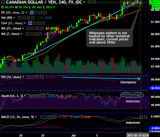 On intraday terms, amid the current upswings, the rallies have shown failure swings at range resistance at 88.722 levels. Consequently, it has formed whipsaws pattern but is not substantiated by any other technical indicators. Bulls have managed to show the stern rallies since 8th June with minor corrections every now and then.