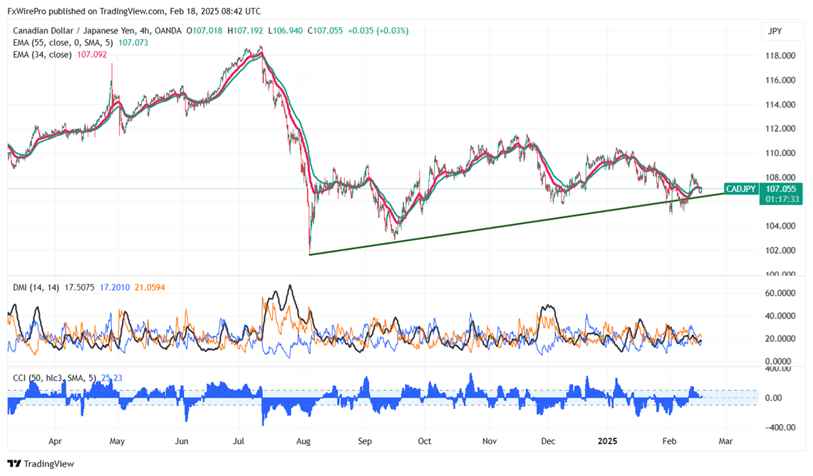 CAD/JPY is currently trading below the 34- and 55-EMA on the 4-hour chart. The immediate resistance is at 107.20; a breach above this level could shift targets to 108/108.35/109.30/110. On the lower side, near-term support is at 106.50, and a break below this support could lead to declines toward 106/104.80/104.