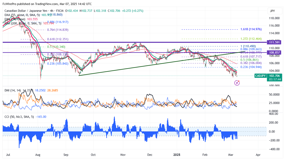 CAD/JPY declined slightly after Canadian jobs data. It hit an intraday low of 102.31 and is currently trading around 102.52.