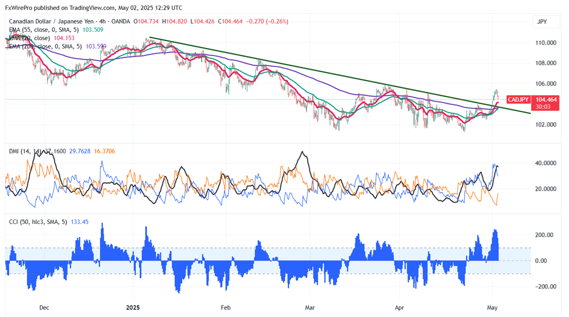 CAD/JPY is currently trading above the 34- and 55-EMA on the 4-hour chart. The immediate resistance is at 105.50; a breach above this level could shift targets to 106/107/108.25. On the lower side, near-term support is at 103.90 and a break below this support could lead to declines toward 103.40/103/102.50/10.65/101/100.