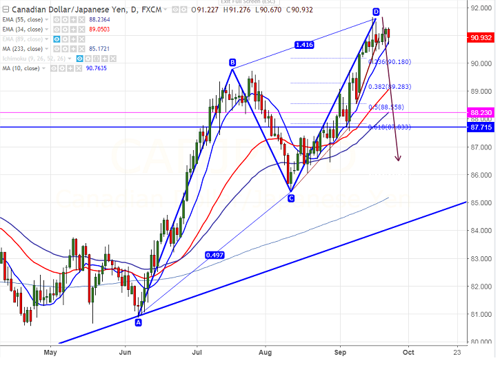 - CADJPY is consolidating in narrow range after hitting a high of 91.63 on Sep 15th 2017 high. It is trading between 91.49 and 90.41 for the past 4 trading session. It is currently trading around 90.95.