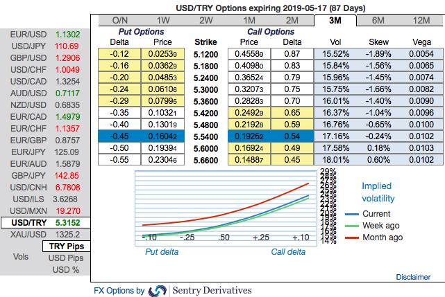 Trade tips: We advocated 3m USDTRY debit call spreads a week ago (3m 5.15/6.77 call spreads at net debit) at spot reference: 5.3035 levels, with a view to arresting upside risks when Turkish Finance Minister Berat Albayrak announced a cheap lending scheme for SME's. The underlying spot has slid a bit but well above ITM strikes, which means our short legs are performing desirably.