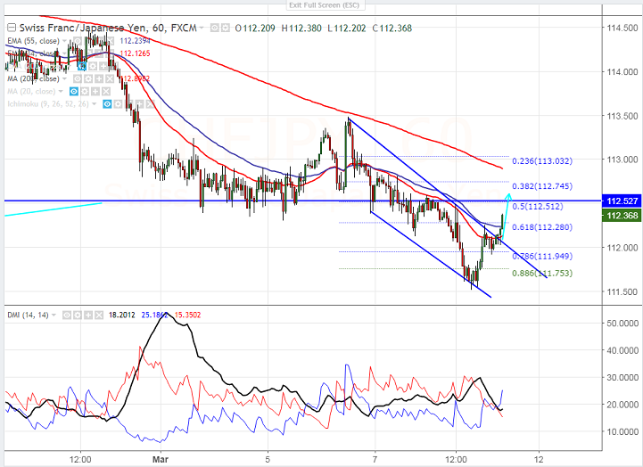 - CHF/JPY has shown a good recovery from the low of 111.51 made yesterday and jumped till 112.36 almost 85 pips. It has declined almost 700 pips from temporary top of 118.55 and is currently trading around 112.38.