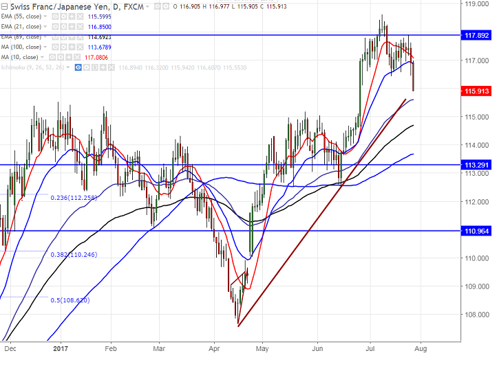 - The pair has broken major support of 116.43 made on Jul 14th 2017. The pair declined till 115.90 at the time of writing and is currently trading around 115.91.
