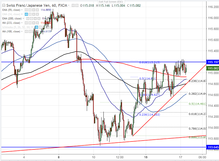 - CHFJPY consolidates in narrow range after hitting high of 115.21 level. The pair declined till 114.92 yesterday and is currently trading around 115.09.