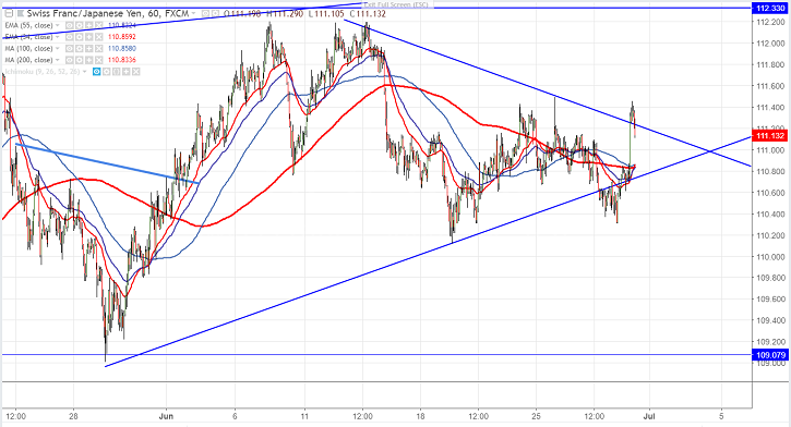 - CHFJPY breaks minor trend line resistance at 111.25 and hits intraday high of 111.45. Intraday trend is bullish as long as support 110.80 (200- H MA) holds. Any hourly close below 110.80 will drag the pair down till 110.30/110.15.