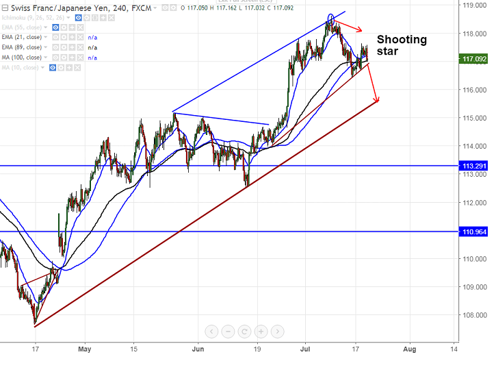 - The pair is declining sharply after hitting a high of 118.60 at Jul 10th 2017. CHF/JPY declined till 116.43 on Jul 14th 2017 and is currently trading around 117.07.