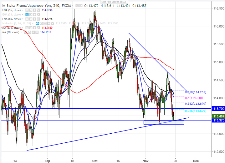 - CHF/JPY has declined sharply after hitting high of 114.70 on Nov 14th 2017. The pair hits low of 113.36 at the time of writing. It is currently trading around 113.46.