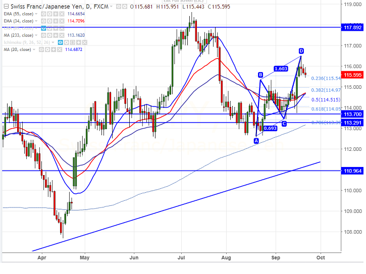 - CHFJPY has pared some of its gains which it has made past one week. The pair hits high of 116.47 on Sep 19th 2017 and is currently trading around 115.66.