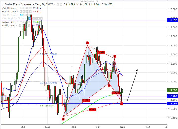 - CHF/JPY has declined continuously for the past six days and shown a minor jump yesterday. The pair dipped till 113.40 and is currently trading around 114.07.