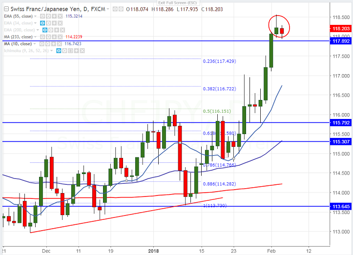 - CHF/JPY has shown a good jump almost 400 pips from the low of 113.73 made on Jan 11th 2018. The pair hits high of 118.55 and is currently trading around 118.20.
