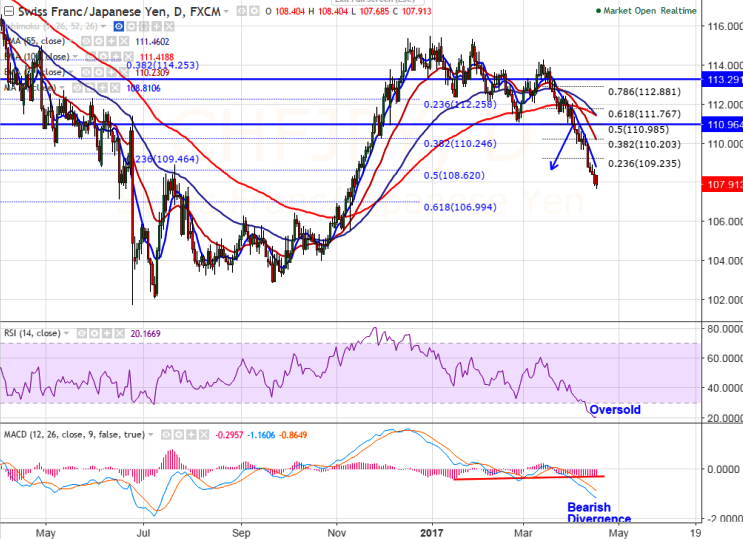 - CHFJPY continuing its losing streak for the past one month after hitting the high of 114.30 on Mar 14th 2017. The pair has broken major support 200- day MA at 109 and declined till 107.68 at the time of writing. It is currently trading around 107.94.