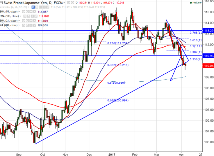 - CHF/JPY continuously showing weakness for the past twenty days and has broken major trend line support at 110.20 yesterday.