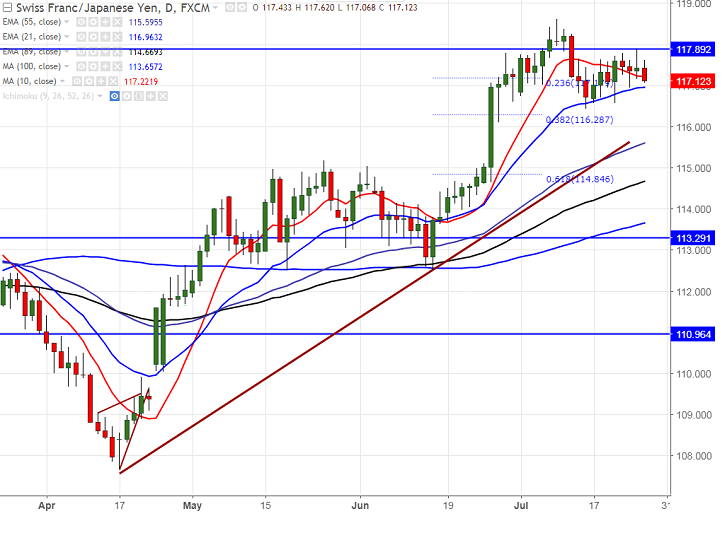 - The pair is consolidating in narrow range after hitting low of 116.43 on Jul 14th 2017. The pair formed minor top around 118.60 at Jul 10th 2017 and any further bullishness can be seen only above that level. It is currently trading around 117.22.