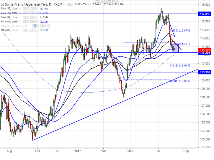 - CHF/JPY has formed a major bottom around 113.41 and shown a minor recovery till 114.08 yesterday. It is currently trading around 113.69.