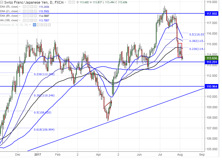 - On the lower side, near term major support is around 113.69 (100- day MA) and any close below will take the pair down till 113/112.50 (Jun 15th 2017).