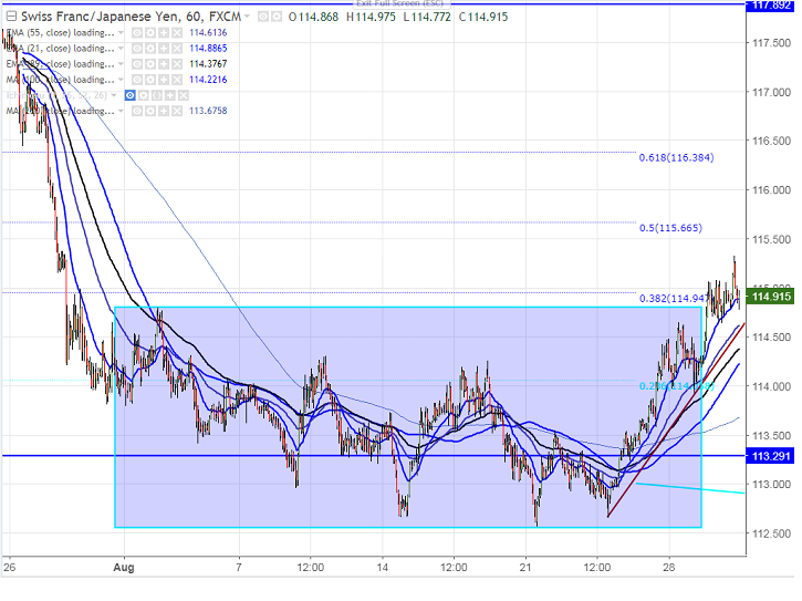 CHFJPY has formed a temporary bottom around 112.65 and started to jump from that level. The pair has broken major resistance 115 and jumped till 115.32 yesterday. The pair is currently trading around 114.93.