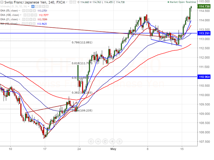 - CHF/JPY broken the previous high of 114.31 made on May 8th 2017 and jumped till 114.67 at the time of writing. It is currently trading around 114.67.