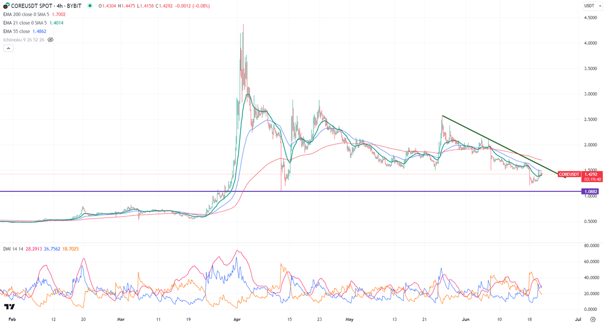 COREUSD has gained more than 25% in the past three days after a more than 50% sell-off. The pair holds above the short-term (21 EMA) , below 55- EMA, and long-term moving average (200-EMA) in the 4-hour chart. It hit a high of $1.5149 and is currently trading around $1.4304.