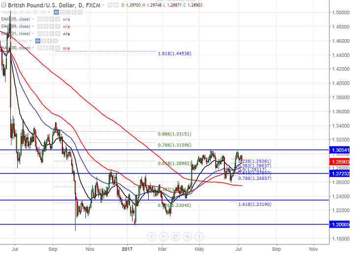 - The pair should break above 1.3050 for further bullishness. Any violation above 1.3050 will take the pair till 1.3110 (113% retracement of 1.30475 and 1.25894)/1.3150/1.33150 (88.6% retracement of 1.3440 and 1.19040). The minor resistance is around 1.29780/1.3030.