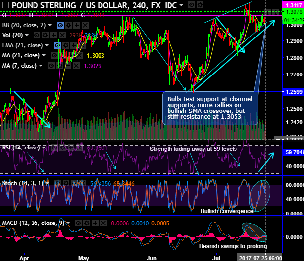 GBPUSD bulls are edging higher at 11-months highs. Bulls test channel supports at 1.3008 levels, more rallies seem to be likely on bullish SMA crossover.