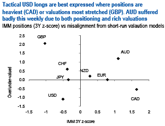 Cable is the most over-valued G10 currency versus the dollar (refer above chart). Indeed, cable is more expensive versus 2Y rate spreads than at any point in the last five years. Fair-value currently languishes at 1.15, more than two sigma below the spot rate (refer above chart).