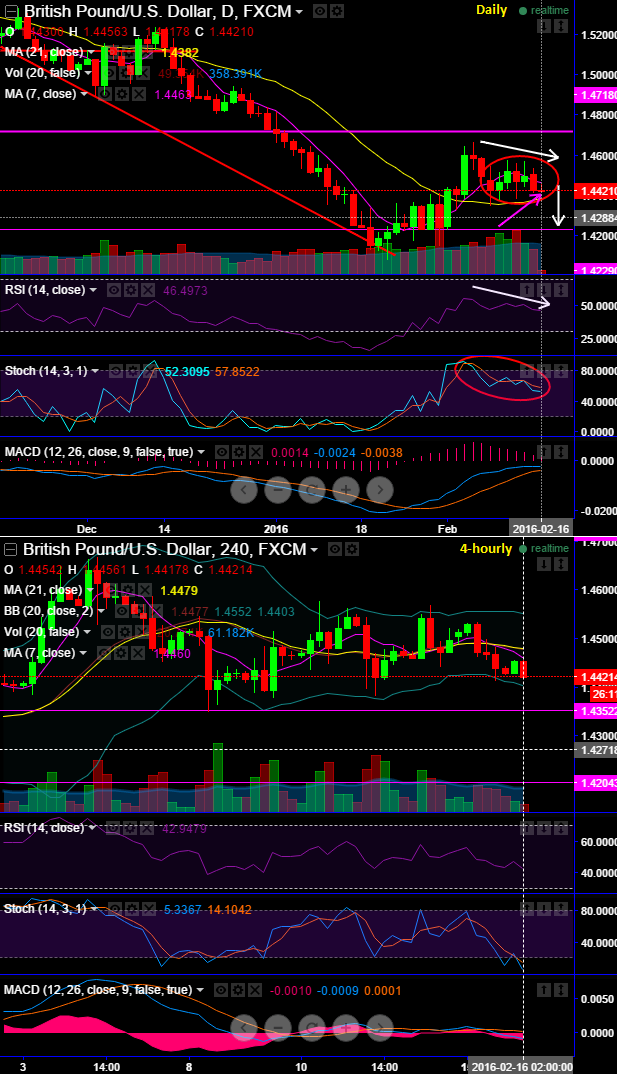 After the formation of "shooting star" at 1.4498 whose highs were rejected at 1.4570 where it has tested resistance several times in the recent past as well. For now, the pair as shown some more weakness to slip below 7DMA and today's highs were rejected at 7DMA (1.4456 levels).