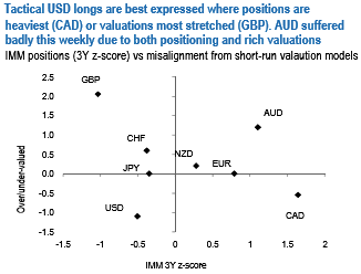 Cable is the most over-valued G10 currency versus the dollar (refer above chart). Indeed, cable is more expensive versus 2Y rate spreads than at any point in the last five years. Fair-value currently languishes at 1.15, more than two sigma below the spot rate (refer above chart). GBP is consequently one of the most attractive currencies to sell for an extension of the dollar’s interest rate rally.