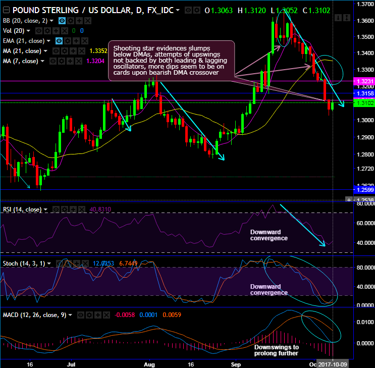 Shooting star has occurred exactly at 1.3495 levels with highs of 1.3658 levels. Consequently, the bearish pattern evidences slumps below DMAs, whereas today’s attempts of upswings are not backed by both leading & lagging oscillators, thus, this is not to be deemed as the better buying opportunity as the more slumps on cards.