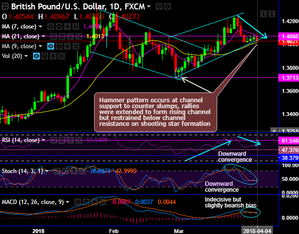 Trade tips: On an intraday speculative basis, contemplating sideway trend for the day, we advocate tunnel spread which is a binary version of debit put options to leverage yields. At spot reference: 1.4025, use upper strikes at 1.4068 and lower strikes at 1.3988 levels. The payoff structure would be certain and exponential as long as the underlying spot FX remains between these strikes on binary expiration.