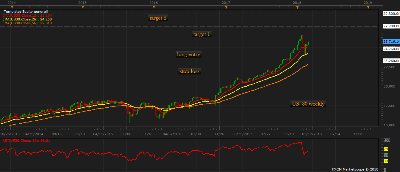 In that piece, we suggested that as long as the support around 23260 area holds, Dow is likely to hit a new record high and reach 27700 area. Since then, the index has moved higher and is currently trading at 25740 area (US30). In this article, we would like to extend our bull side target from 27700 to 29300, to be reached over the course of 2018. Book 40-50 percent of the profits at the now interim target of 27700 area.