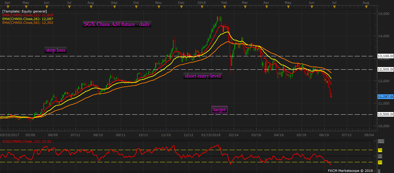 In May this year we called on our readers to go short in Chinese shares; to be specific SGX China A50 future, which is a future contract on largest 50 A share companies by full market capitalization of the securities listed in Shanghai and Shenzhen stock exchanges. A CFD (Contract for difference) instrument is also available on SGX A50 future; that is CHN50 offered by FXCM. Here is the link, https://www.econotimes.com/FxWirePro-Sell-SGX-FTSE-China-A50-Future-targeting-15-percent-decline-1298413