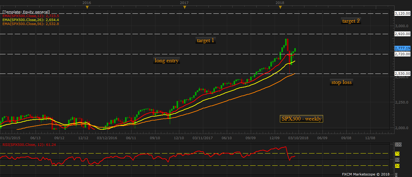 In that piece, we suggested that as long as the support around 2530 holds, S&P500 is likely to hit a new record high and reach 2920 area. Since then, the index has moved higher and is currently trading at 2780 area. In this article, we would like to extend our bull side target from 2920 to 3120, to be reached over the course of 2018. Book 40-50 percent of the profits at the now interim target of 2920 area.