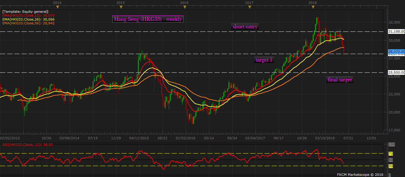 We called on our readers to go short in the Hang Seng index (HKG33 for CFDs) at the then current rate of 31188 with a 10 percent target (28070) and the stop loss around 33500 area.
