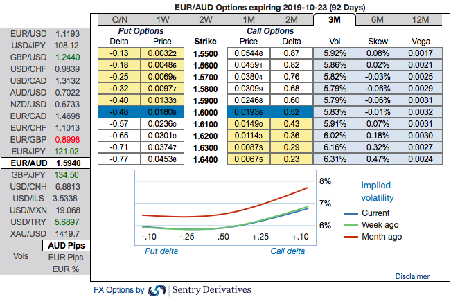 OTC Indications and Options Strategy: Please be noted that IV skews of EURAUD are stretched on either side, the positively skewed IVs of 3m tenors are signifying more hedging interests in both bullish and bearish risks. But more bids for OTM calls of this tenor indicate that the underlying spot FX likely to spike up to 1.64 levels and bids for OTM puts show 1.55 levels.