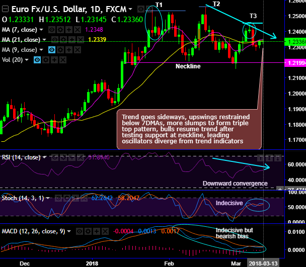 EURUSD minor trend goes sideways today, while the upswings restrained below 7DMAs, more slumps to form the triple top pattern (refer daily chart).