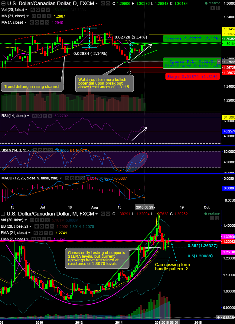 On a broader perspective, the pair has dipped from the highs of 1.4689 levels to the current 1.2460 (i.e. almost more than 38.2% Fibonacci retracements) within a span of 4 and half months. But for now, jumped above from that level and been consistently testing of supports 21EMA levels, but current upswings have restrained at the resistance of 1.3070 levels.