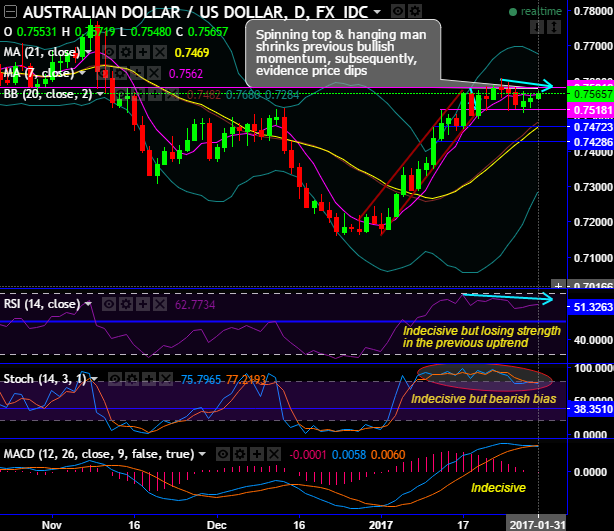 Spinning top & hanging man patterns have been traced out at 0.7579 and 0.7571 level that has evidenced price dips below 7DMAs, but bulls have managed to bounce back (refer daily), holding stronger at 7DMAs, channel resistance, and 21EMAs again (refer monthly).