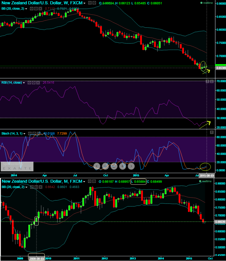 Inverted hammer pattern candle occurred exactly at 6 years lows of 0.6587, the pair at this psychological juncture testing supports as 14 weeks RSI shows positive convergence with spiking pricess as it crossed below 30 levels which is oversold zone. To substantiate this view on weekly charts slow stochastic curves are also acting in sync with standpoint offered by RSI. Currently, RSI (14) is trending at 26.2389 and %K line crossover below 20 signifies a certain short term price recoveries if not long term bull sentiments.